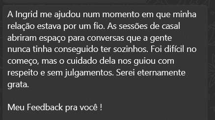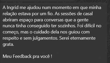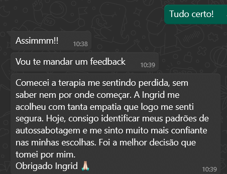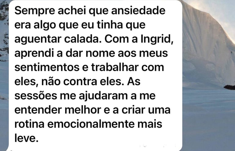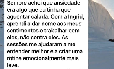Desde a primeira sessão com a Ingrid, senti uma diferença enorme na forma como eu me percebo e lido com meus sentimentos. Ela tem uma escuta muito atenta e um jeito acolhedor que faz a gente se abrir naturalmente. A TCC me ajudou a enxergar padrões que estavam me sabotando há anos. Recomendo de olhos fechados, principalmente pra quem está começando a cuidar da saúde emocional agora.